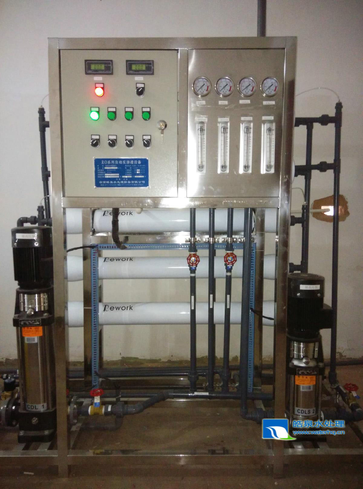 其目的是濾去由于預(yù)處理工序可能帶來的大于5μm的顆粒、雜質(zhì)。在預(yù)處理工序后由于這些顆粒經(jīng)反滲透(RO)主機(jī)的高壓泵后可能會(huì)擊穿反滲透膜組件,從而造成大量鹽漏和串水現(xiàn)象,影響出水水質(zhì),同時(shí)也可能會(huì)劃傷高壓泵的葉輪。